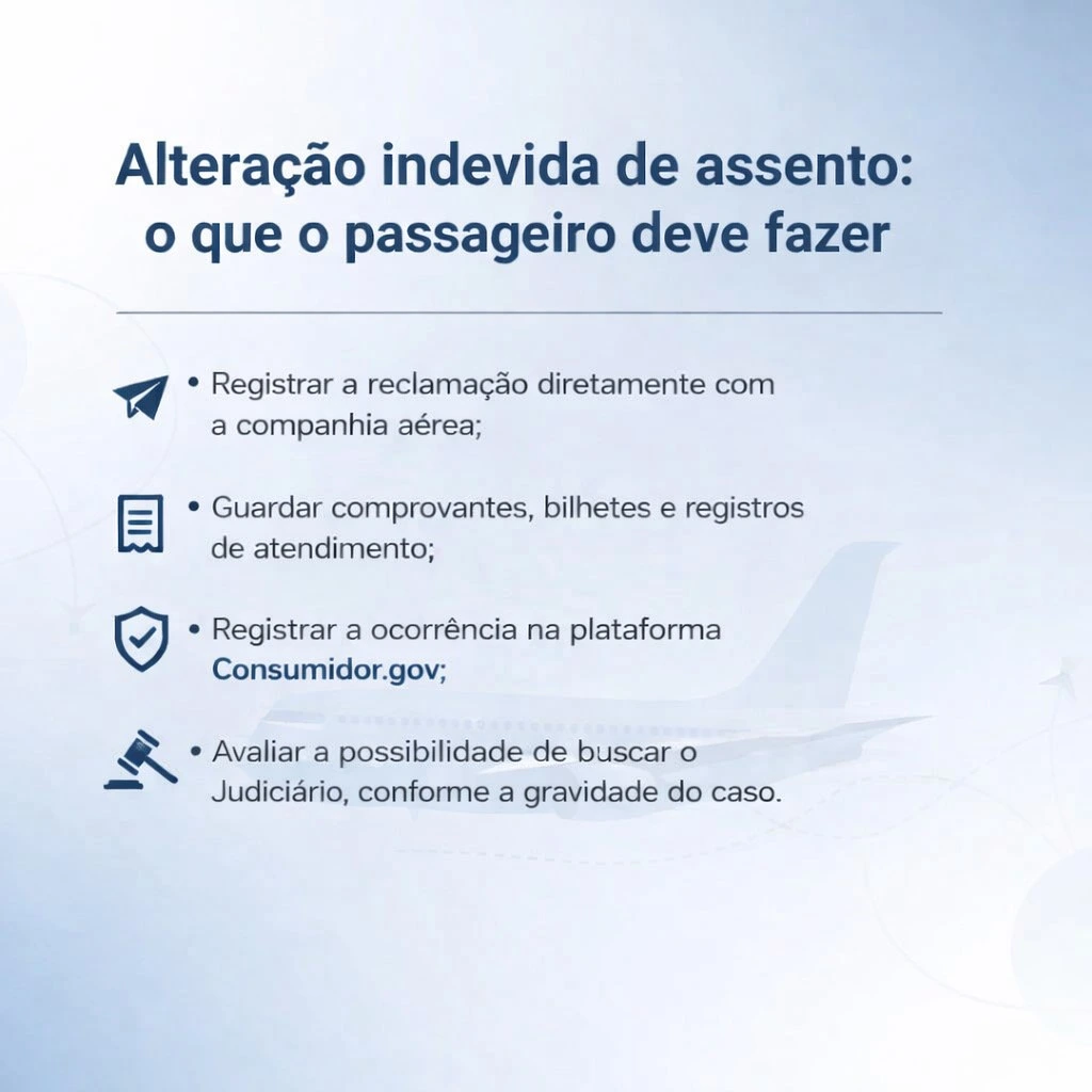 Em situações de overbooking ou reacomodação operacional, a empresa aérea deve seguir regras específicas. A prioridade é buscar voluntários para mudanças de assento ou de classe. Quando a realocação é involuntária, o passageiro tem direito à informação clara sobre o motivo da alteração, além de eventuais compensações, dependendo do impacto da mudança.